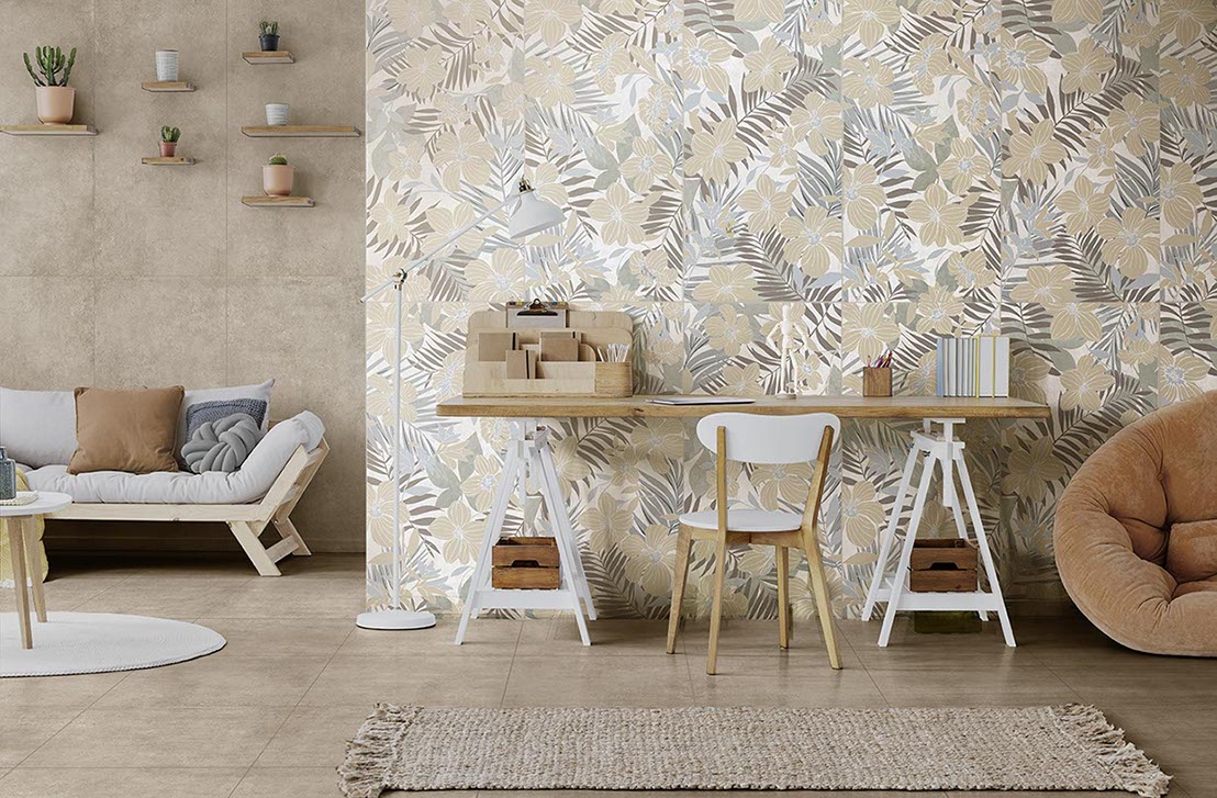 Les tableaux « Natura » mettent en scène des éléments naturels. Fougères, Hibiscus et Prairie sont des variantes graphiques disponibles en deux teintes chaudes et froides, avec des agencements totalement différents. La beauté de ce concept réside dans sa polyvalence : il s’intègre parfaitement à l’ensemble de la collection Savoia et, au format 60 x 120, il sublimera toutes les surfaces de la maison.
